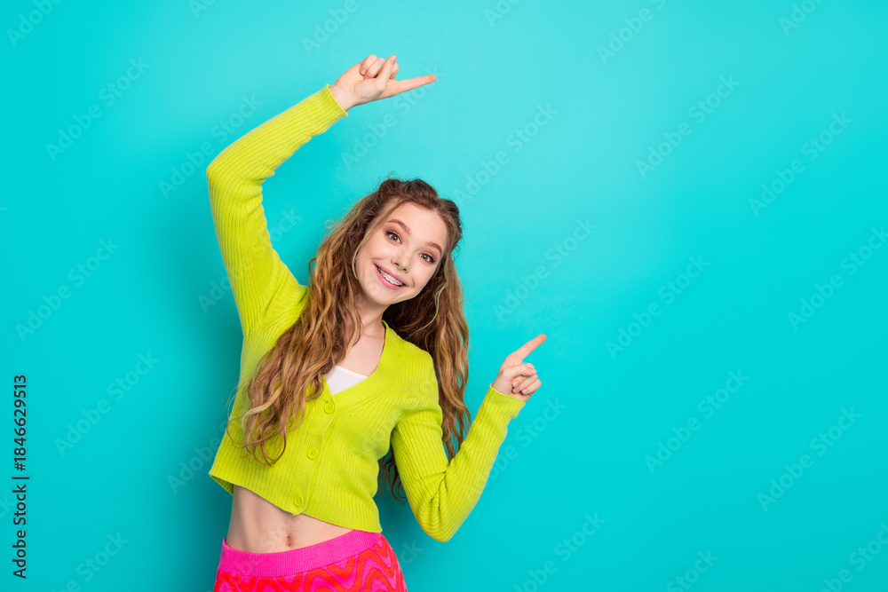Attractive young woman posing in a bright outfit with a cheerful smile against a vibrant teal background