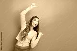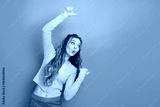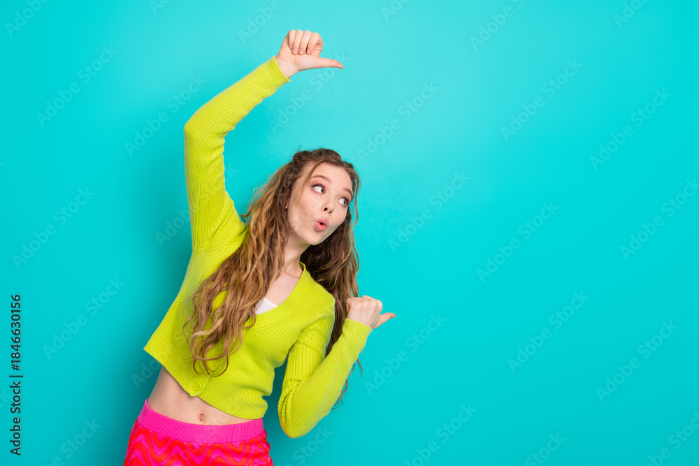 Energetic young woman in colorful casual attire gesturing professionally against a vibrant teal background