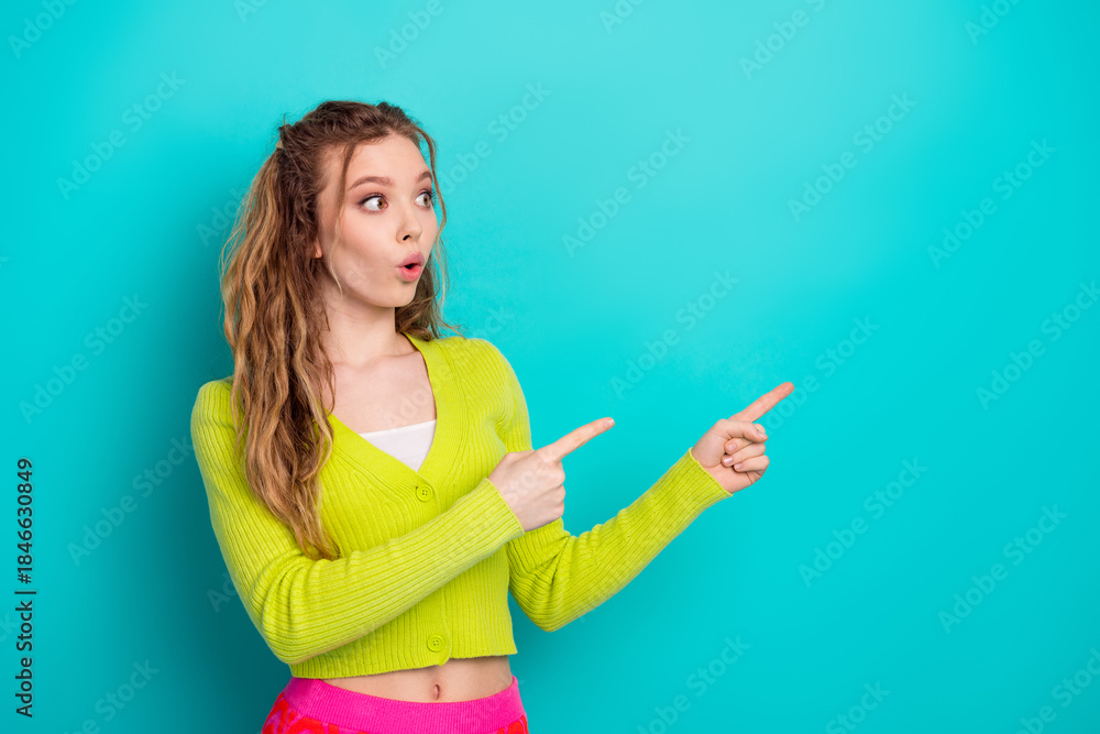 Young woman gesturing expressively in vibrant outfit against teal background with surprised look on her face