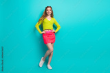Stylish young woman posing confidently in colorful outfit against teal background during a fun casual photoshoot