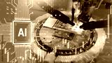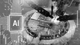 Semiconductor engineering develops AI microchips under a microscope. Microelectronics manufacturing, artificial intelligence hardware design, advanced chip fabrication.