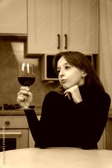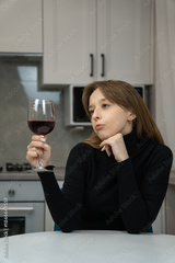 Young woman savoring a glass of red wine in a stylish modern kitchen, reflecting on the moment with a thoughtful expression while enjoying a peaceful break indoors