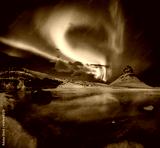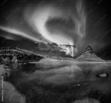 Kirkjufell mountain with beautiful aurora borealis and frozen water falls