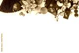 Bright vibrant gold and red Chinese New Year background with mandarin oranges, blossom tree branches, decorative fans, festive greeting envelops and coins, traditional Chinese New Year ornaments