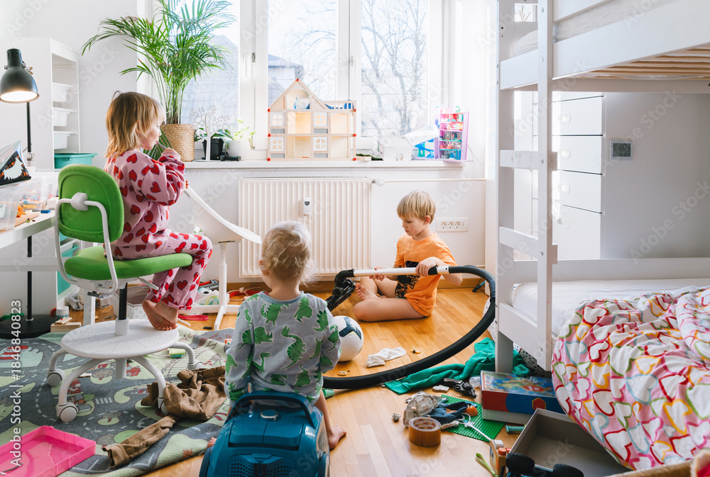 Children's room. Children elementary ages playing and cleaning in messy nursery. Boy vacuums the room while others siblings play. Child's playroom full of toys. Family at home.