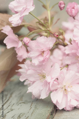 Rustic style Spring background with pink Japanese cherry blossom close up