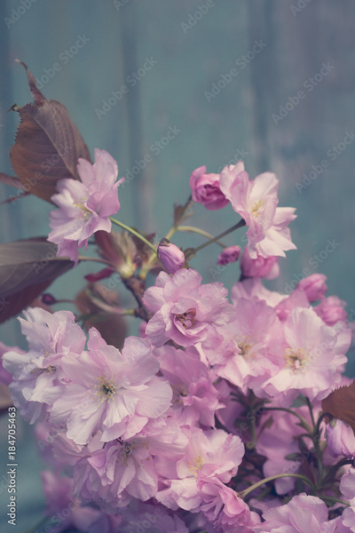 Rustic style Spring background with pink Japanese cherry blossom close up