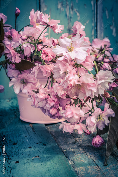 Romantic Spring background with a vase of Japanese cherry blossoms on wooden table