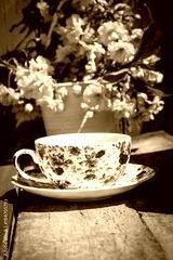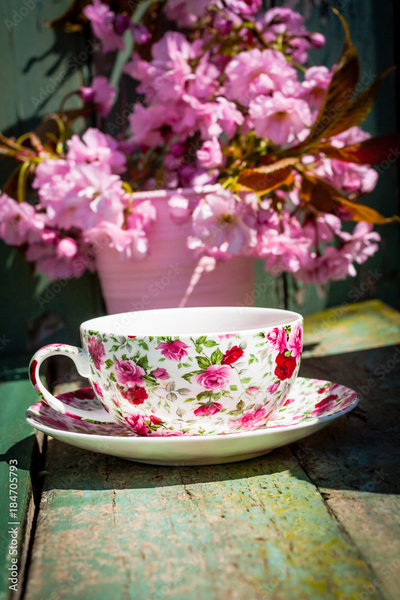 Beautiful, English, vintage teacup with Japanese cherry tree blossoms, close upt