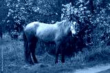 Gray Horse Standing Near Blossoming Trees in Spring Meadow