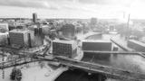 Aerial panoramic view of Tampere city center at sunset, Finland at winter