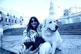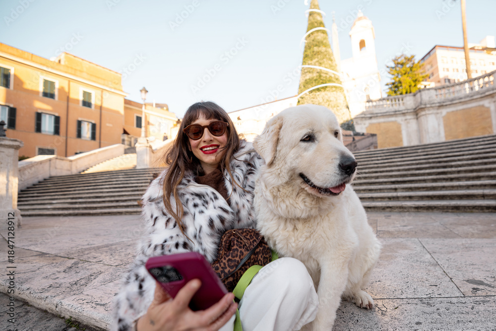 Woman taking a festive selfie with her dog near the Spanish Steps in Rome with a decorated Christmas tree in the background. Holiday atmosphere, winter tourism, joyful city break travel and European