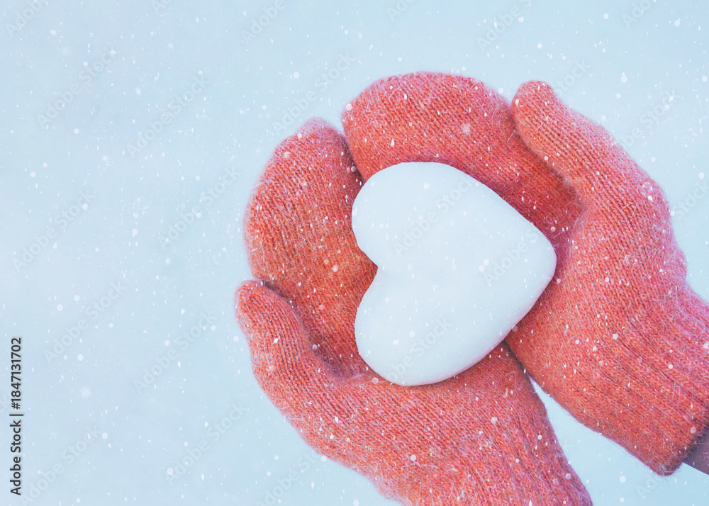 Hands in knitted mittens with heart of snow in winter day. Love concept. Valentine day background.