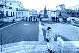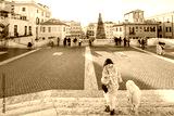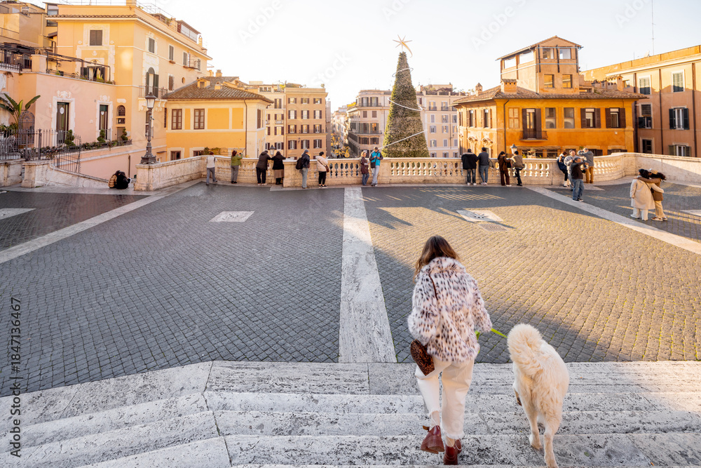 Woman walking with a dog toward a festive square in Rome near the Spanish Steps. Holiday atmosphere, winter tourism, city break, New Year celebration, joyful travel, freedom and European lifestyle