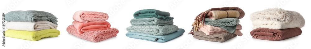 Set of soft folded blankets on white background