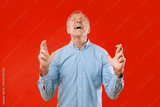 A man in a blue checkered shirt shows a clear sign of frustration. He raises his hands and tilts his head back. The background is a solid red color. The setting is simple and direct.