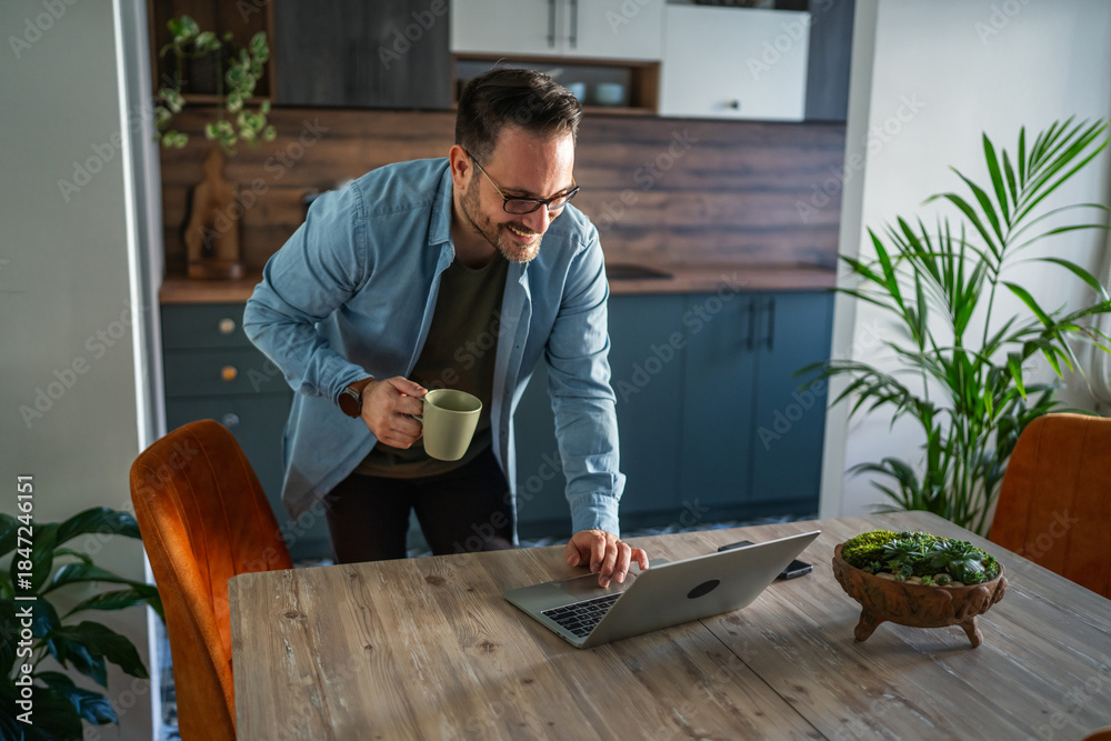 Happy man working remotely at home with laptop and coffee