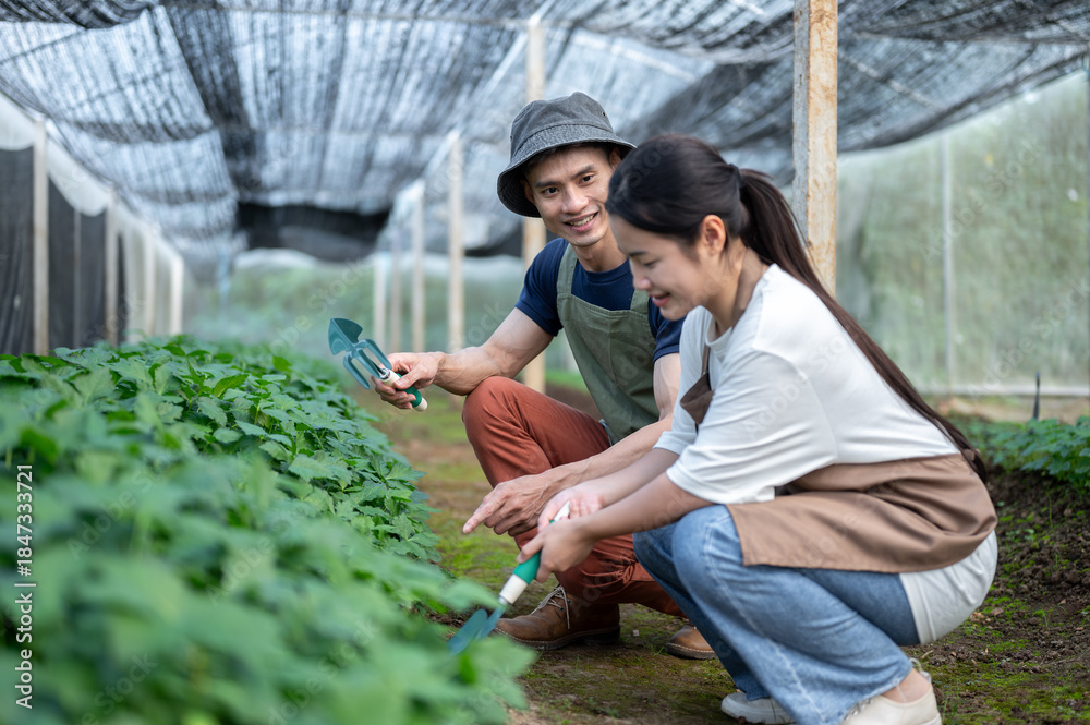 Asian farmer man teaching young woman growing tending vegetable plants in greenhouse of organic farm