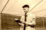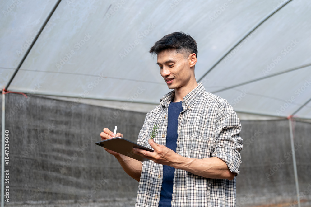 Asian farmer man in checkered shirt writing in clipboard holding herb plant as working in greenhouse