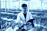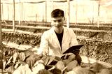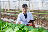 Glasses asian agricultural scientist man holding tablet and looking at vegetables in greenhouse farm