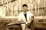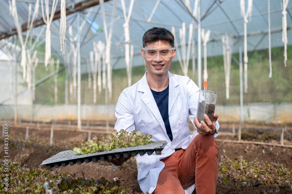 Asian agricultural scientist man holding soils beaker and vegetable planting tray in greenhouse farm