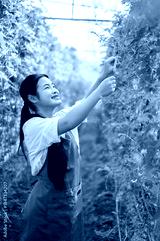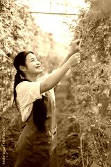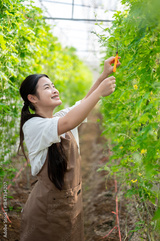 Young asian woman holding scissors cutting trimming vegetable plants trellis in a greenhouse farm.
