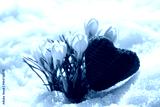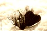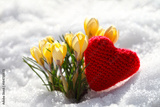 Crocuses yellow blossomed against the background of snow in the spring. The red heart is knitted from hand-woven woolen threads.