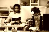 Young adult man with curly hair and glasses wearing headphones working at computer while holding green apple, Black man with dreadlocks reading book in background at office desk