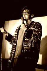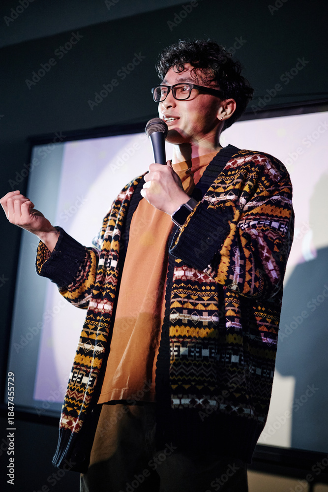 Young adult Asian man standing on stage holding microphone, speaking to audience with expressive gesture, wearing glasses, engaging in public speaking or stand up comedy performance