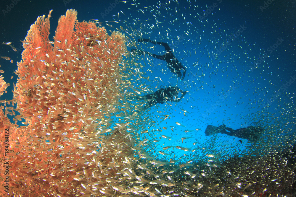 Scuba divers exploring coral reef