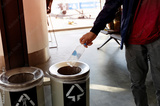 Man hand putting plastic bottle waste into garbage trash in the airport