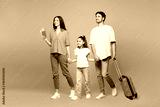 Traveler parents mom dad child wear casual clothes hold passport ticket bag go isolated on plain blue background. Tourist travel abroad in free spare time rest getaway Air flight trip journey concept