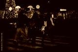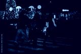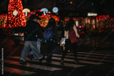 Teenagers walk across a crosswalk at night beneath festive Christmas lights in the city. A group of teens with backpacks move together through a bright, holiday-lit street.