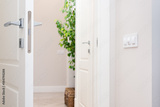 Close-up elements of the interior of the apartment. Ajar white door. Chrome door handle and lock