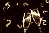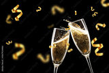 Two champagne flutes clinking with golden confetti falling on a black background. Festive toast, luxury celebration, New Year party, and wedding anniversary concept with elegant splashes.