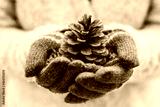 Girl holding pine cone in her hand. Winter decoration.