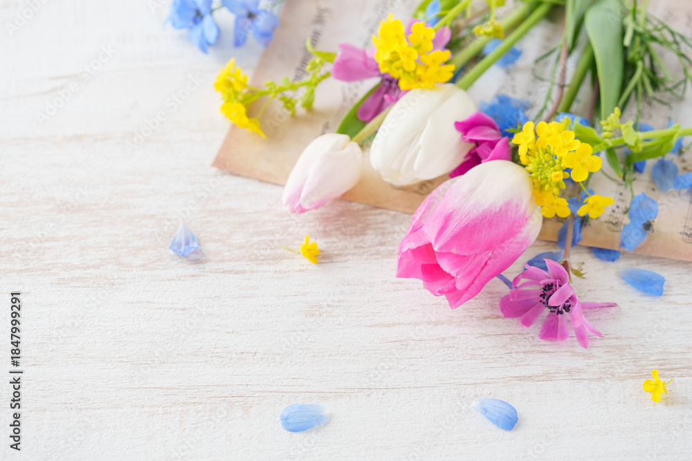 チューリップと菜の花など春の花の背景