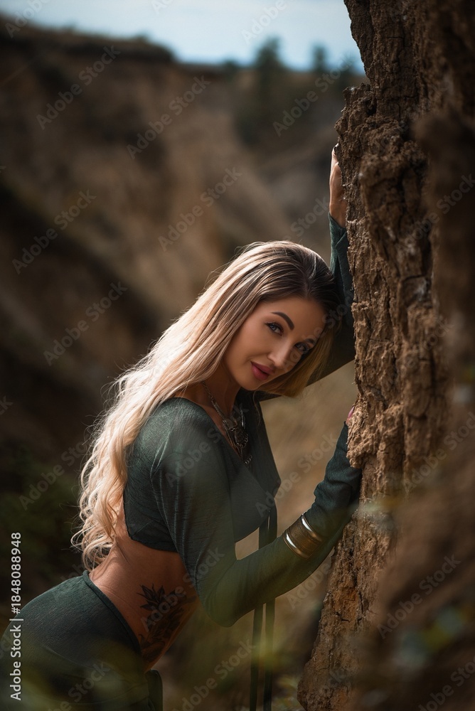 Beautiful woman in green dress on sandy desert background. Ancient queen.