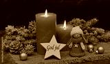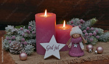 Christmas card: Pink candles with Christmas decorations and a small doll on a star bears the Swedish greeting God jul.