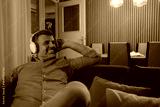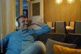 Middle-aged man listening to music online at home