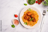 Spaghetti pasta with meatballs and tomato sauce on a plate with white background, top view