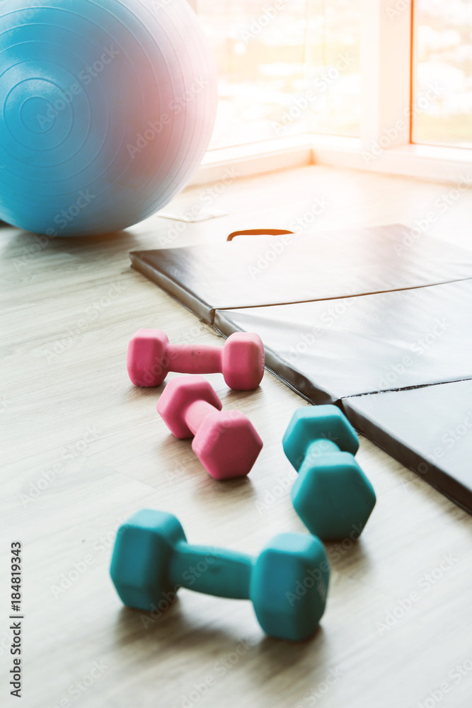 healthy concept with fitness center dumbell rack and yoga ball with exercise mat on wooden floor with background of blue sky