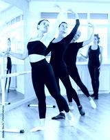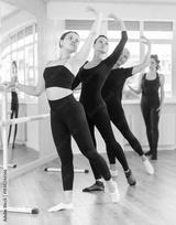 Female ballet dancers doing various ballet movements at a ballet barre in fifth position