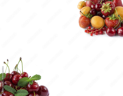 Ripe strawberries, red currants, apricots and cherries on white background. Berries with copy space for text. Background berries. Various fresh summer berries.