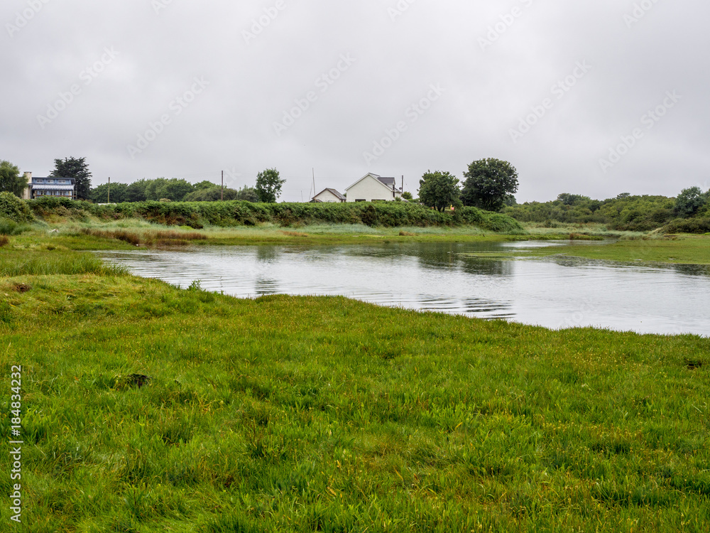 Boats moored at Poppit sands beach at high tide, Poppit Sands, St Dogmeals, Pembrokeshire, Wales, UK