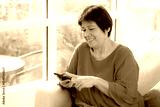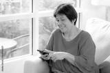 Senior asian woman smile while using on smartphone sitting on sofa in living room at home, digital lifestyle, cheerful elder asian using smart phone with social media for relax, chatbot or AI.