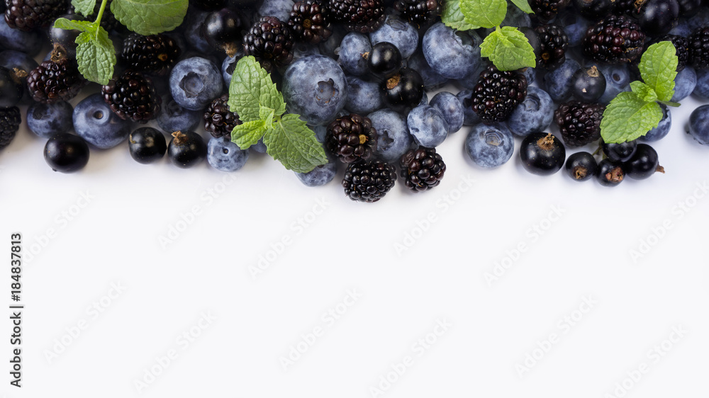 Black-blue berries on a white. Ripe blueberries, blackcurrants and blackberries. Berries at border of image with copy space for text. Top view. Various fresh summer berries on white background.