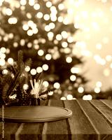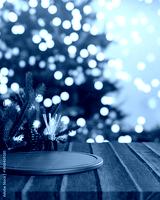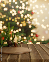 Pinecone and diffuser aside wooden tray at counter table across Christmas tree with light decoration