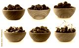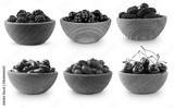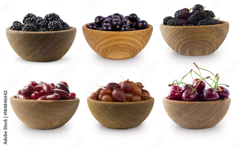 Black-blue and dark red berries isolated on white. Collage of different fruits and berries. Blackberries, mulberries, black currants and cornels, gooseberries, cherries.
