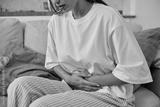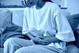 Young adult Caucasian woman sitting on sofa holding stomach with both hands appearing to experience abdominal pain or discomfort, upper body and face partially visible